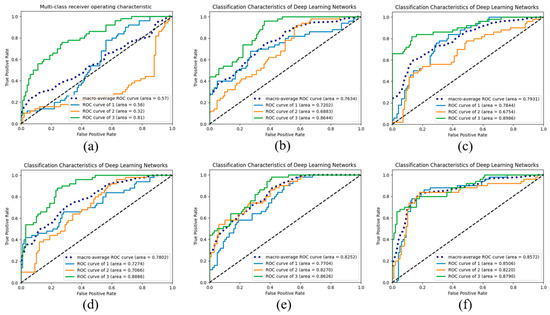 The ROC curve and the AUC value of each network: (a) Vision Transformer; (b) ConvNeXt; (c) ConvNeXt + SA; (d) ResNet50; (e) ConvNeXt + ECA; (f) ConvNeXt + CBAM. The black dashed line is the baseline, and the farther the ROC curve is from the baseline, the better the model’s prediction is.