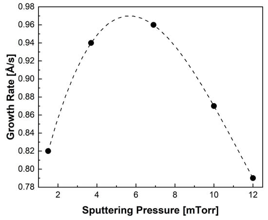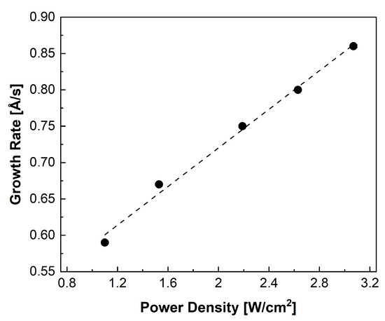By fixing the argon pressure at 15 mTorr, the growth rate was found to be nearly linearly dependent on the RF sputtering power density, as reported in Figure 2. The phenomenon, also observed in [32,33], is linked to the increase in the kinetic energy of argon ions that occurs as the sputtering power increases. This, in turn, leads to an increase in the number of ions expelled from the target and subsequently deposited onto the substrate.