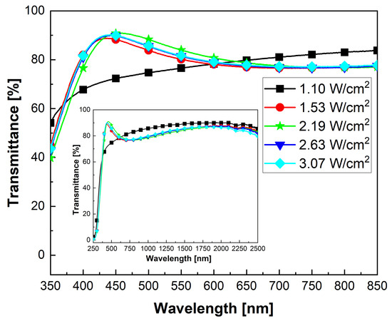 The optical properties of the ITO films deposited at 15 mTorr at room temperature were investigated as a function of the power density. The measured transmittance spectra are shown in Figure 3. Apart from sample 1, which did not exhibit interference fringes due to the limited thickness [13] as a consequence of the low growth rate, all obtained ITO films deposited on glass substrates showed an average transmittance between 80% and 85% in the visible and NIR regions of the electromagnetic spectrum. Below 400 nm, the ITO films exhibited strong absorption due to sub-band and band-to-band absorption [34]. At 550 nm, the ITO film obtained at a power density of 2.19 W/cm2 showed the highest transmittance, equal to 82%, among the prepared ones (Figure 3).