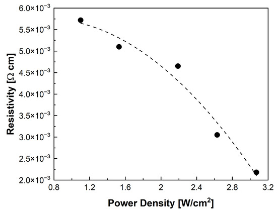 Additionally, the electrical characteristics of these samples were examined. Figure 4 illustrates the relationship between the resistivity of the films and the sputtering power density.