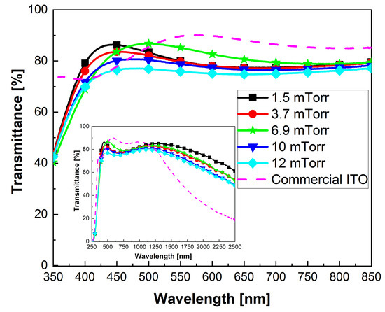 At the fixed power density of 2.19 W/cm2 while keeping the process at room temperature, samples were deposited at different sputtering pressures, and the corresponding properties were also evaluated. Figure 5 shows the relation between the growth rate of ITO and the pressure of argon. Among the tested argon pressures, the highest growth rate was observed at 6.9 mTorr. At higher pressures, the deposition rate decreased since there was an increase in the number of collisions between the sputtered particles and the argon atoms. Conversely, at low argon pressures, there was a decrease in the sputtering efficiency due to the low concentration of carrier near the magnetron region [37]. This means that an intermediate pressure exists where the growth rate is maximum [34]. Table 2 displays the deposition parameters together with the resulting thickness, growth rate, and resistivity of the obtained ITO thin films. The optical properties were also investigated as a function of the sputtering pressure. Figure 6 shows the optical transmittance of ITO films, having quite similar thickness, deposited on glass at different sputtering pressures and keeping a fixed power density of 2.19 W/cm2 and room temperature. Figure 6 also reports the transmittance curve of the commercial ITO on glass substrate, here used as reference, whose thickness was 150 nm. The ITO films deposited at 6.9 mTorr showed the highest transmittance (about 85%) in the visible region (at 550 nm) and an average transparency of 82% in the wavelength range from 400 nm to 800 nm. These values are close to those of the commercial ITO, which in turn exhibited a transmittance of 89% at 550 nm and an average transparency of 85% in the range from 400 to 800 nm. The obtained results have to be considered satisfactory, especially considering that these samples were fabricated with no oxygen addition during the process, which is able to increase the transparency of ITO thin films [38]. Regarding the specific influence of sputtering pressure on the optical properties of the ITO samples, the data presented in Figure 6 show that the average transmittance within the visible range of the spectrum was nearly 80% when the sputtering pressure was below 6.9 mTorr. Further pressure increases resulted in a decrease in the average transmittance, which was found to be 75% for the sample obtained at the pressure of 12 mTorr.