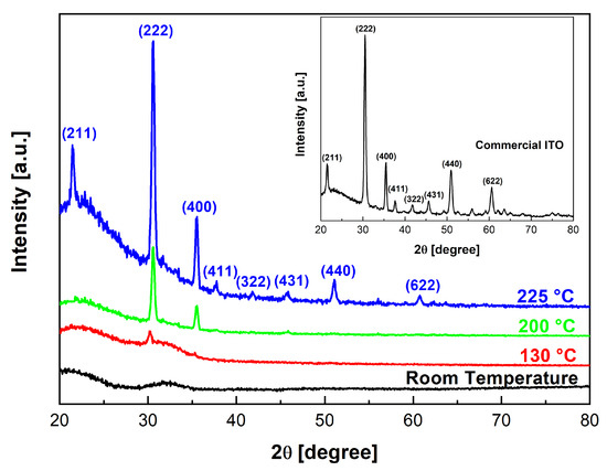 The analysis of the XRD patterns (Figure 8), shows a transition from an amorphous state to a polycrystalline state as the substrate deposition temperature increased. Films grown at substrate temperatures lower than 130 °C were amorphous, with a broad structure in the XRD spectrum. Crystallization was observed on the (222) plane at substrate temperatures ranging from 130 °C to 225 °C. This plane represents the preferred orientation of the films, and from a thermodynamic viewpoint, it corresponds to the plane with the lowest surface energy [45]. Others peaks, including the (211) and (400) ones, also appeared at high substrate temperatures. The observed orientation and diffraction peaks are characteristic of Sn-doped polycrystalline In2O3 thin films [44,46,47,48]. Similar crystallinity dependence was reported in [49], in which the authors observed changes in crystallization orientation with the increase in density power, which closely matches the changes documented in this study at the specified substrate temperatures. This behavior in crystalline growth can be clarified by the assertion made by Kumar and Mansingh. According to them, if the samples are obtained by the bombardment of more energetic particles and/or by particles that possess high energies upon reaching the growth surface, the (400) orientation can also become favored [50]. The inset of Figure 8 reports the XRD pattern of the commercial ITO, which shows the typical bixbyite structure (In2O3) (PDF card No. 006-0416) characterized by several peaks, also detected in the ITO samples here fabricated. It is worth noting that the data given in this work indicate that raising the substrate temperature is crucial to enhancing the crystallinity of the films. Due to their growth being induced by a non-reactive sputtering method, the presence of oxygen vacancies could potentially contribute to the changes in crystal orientation. Indeed, the number of oxygen vacancies is significantly influenced by the temperature of the substrate. This number can be expected to increase in the films obtained at high temperatures and in a no-added-oxygen deposition environment [51,52].