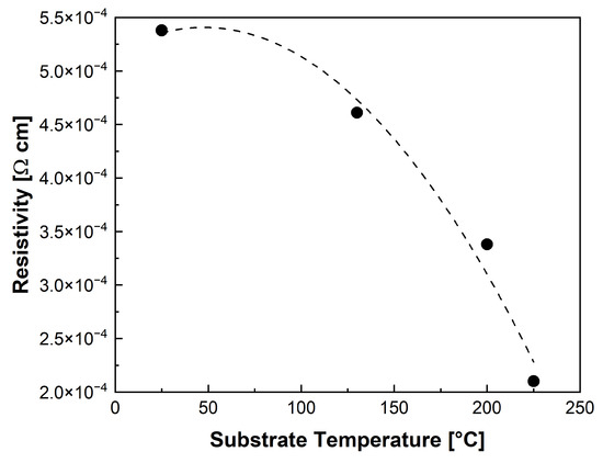 The electrical properties of the films as a function of deposition temperature were also evaluated. In particular, Figure 9 illustrates a decrease in resistivity as the temperature of the substrate increased. The alteration in the preferred crystallization orientation may also have the beneficial effect of reducing the resistivity values in response to the increase in temperature. The lowest resistivity of Ω cm corresponding to a conductivity of 4763 S/cm was obtained at 225 °C for a 120 nm thick film. The increase in the conductivity of the films can be ascribed to the high level of crystallinity, leading to less scattering at the grain boundaries. This is a very important result, given that these films were not grown or annealed in an oxidizing environment. Furthermore, the obtained value of conductivity is very close to the commercial ITO’s (about 5500 S/cm), thus confirming the good quality of the ITO samples here fabricated.
