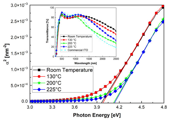 The optical transmission measurements performed on the films, reported in the inset of Figure 10, showed that in the range between 400 nm and 1100 nm, transmittance does not change much with the increase in substrate temperature, as reported in [53], remaining above 80%. In particular, the 120 nm thick film obtained at 225 °C showed a transparency equal to 89% at 550 nm and an average transparency of 85% in the range of wavelength between 400 and 800 nm, which are exactly the same values characterizing the commercial ITO. The high transparency in the visible region of the spectrum is a consequence of the wide bandgap of the obtained ITO films, which can be calculated from Equation (1) [52], that links the absorption coefficient with the transmittance T and the reflectance R of a film with a thickness t, plotting as a function of photon energy.