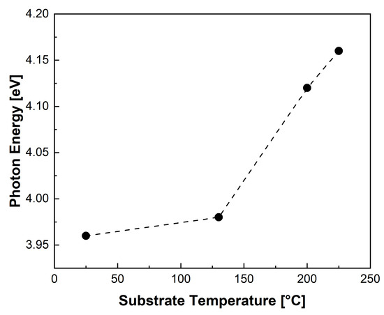 By extrapolating the linearly increasing part of the curve that shows the relationship between the absorption coefficient and photon energy, it is possible to determine the bandgap values of these films, as shown in Figure 10. The obtained values, ranging from about 3.95 eV to about 4.17 eV, show an increase in the bandgap value with respect to the substrate temperature increase, as also reported in Figure 11. The gradual increase in the deposition temperature results in an increase in the number of carriers that fill the lowest energy states in the conduction band, resulting in a bandgap widening, as explained by the Burstein–Moss shift model [51,54,55,56].