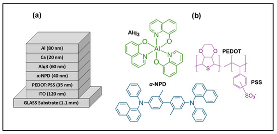 The electro-optical measurements of the OLEDs were conducted within a glove box (H2O and O2 < 1 ppm) without device encapsulation. The devices were characterized through voltage–current measurements by using a Keithley 2400 SourceMeter (Tektronix Srl, Milano, Italy).