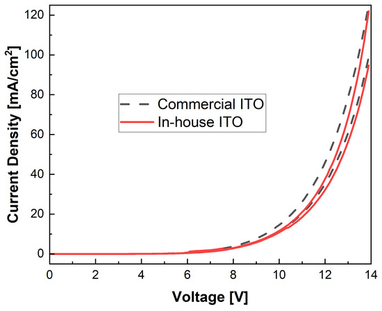 Figure 13 shows the current density vs. voltage curves of the devices made with commercial ITO and in-house ITO. They exhibited similar electrical performance. This suggests that assuming that the materials and interfaces in all the devices behaved the same, the two types of ITO had similar work functions. It is important to underline that the focus of this study was not on optimizing the performance of the OLEDs, thus sub-optimal characteristics are not critical in this regard.