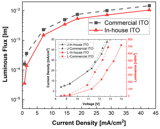 Figure 14 depicts the average measured luminous flux value for each type of device as a function of the current density, while the inset shows a comparison between the current density vs. voltage and luminance vs. voltage of the OLEDs. These optical measurements further confirm that both types of devices achieved comparable performance.