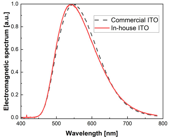 The emission spectra for the two types of devices (shown in Figure 15) exhibited similar peak wavelength (547 nm for the device with commercial ITO and 542 nm for the device with in-house ITO) and comparable bandwidths. The slight difference observed could be attributed to cavity effects generated by small thickness differences in the layers of the device, mainly of the ITO films [60].