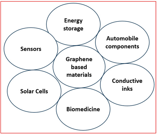 Figure 5 displays the application areas of graphene-based composites. Applications like energy storage, automobile components, conductive inks, biomedicine, solar cells, sensors, etc., were clearly noted from the literature [92].