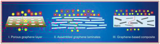 Membrane separation is one of the technologies that can solve environmental problems. The functionalization of the graphene membrane can be easily performed as it contains nanopores. By altering the shape and pore size, stability and selectivity may be improved. If the thickness of the membrane is reduced, permeability will be increased and achieve better performance [96]. This paper mainly concentrates on graphene-based membranes with multiple layers reported after 2015. Figure 7 shows graphene-based membranes.