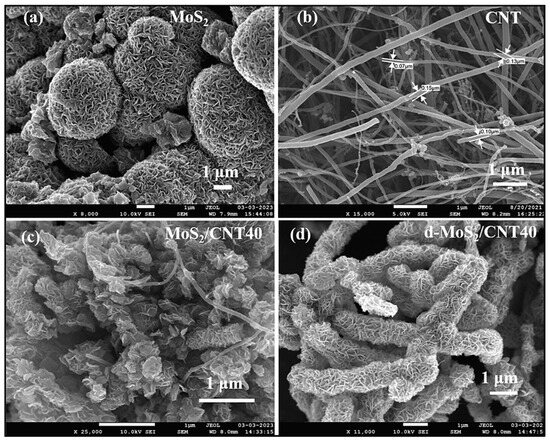 FESEM images of (a) MoS2; (b) CNT; (c) MoS2/CNT40; and (d) d-MoS2/CNT40, Copyright [250].