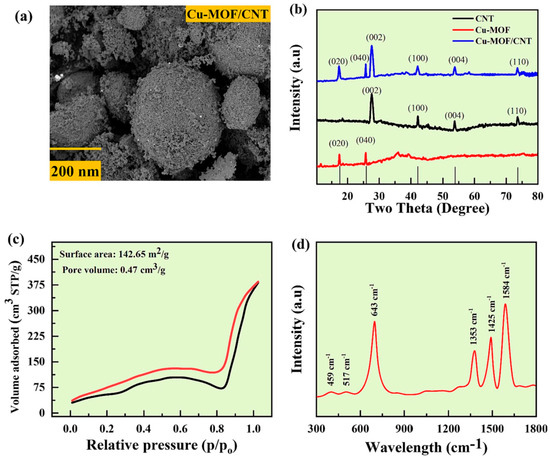 (a) SEM image of Cu-MOF/CNT; (b) XRD of Cu-MOF/CNT, CNT and Cu-MOF; (c) BET analysis of Cu-MOF/CNT; (d) Raman spectra for Cu-MOF, Copyright [251].