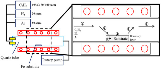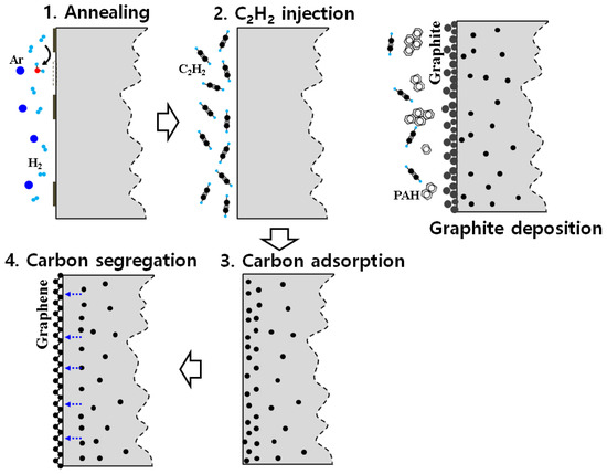 Iron, one of the transition metals, is a very useful material because it is cheap and easy to access. In contrast to other transition metals, iron is used to increase strength in the carburizing process. In recent research, several studies have been conducted on forming graphene on an iron substrate during the carburizing process [24,25]. Graphene formed on the iron surface or grain boundaries not only provides superior mechanical and electrical properties at the outermost surface compared to conventional carburization, but also provides high corrosion resistance and durability to the iron surface with high chemical safety. Theoretically, it is feasible to form graphene on the iron surface. This is because, at room temperature, the lattice constant of iron (2.86 A) is close to that of graphene (2.46 A) [26]. Iron has allotropes such as ferrite phase and austenite phase depending on the heating temperature, and the carbon solubility limit is 0.022 wt.% and 1.43 wt.%, respectively. Therefore, it is necessary to employ carbon at a temperature (above 730 °C) where austenite exists, and then to force outward diffusion of the carbon employed on the surface through continuous cooling at a temperature that transforms into ferrite (less than 730 °C). Figure 1 shows the mechanism by which carbon is applied to the iron (Fe) surface according to the CVD process. After heating to the target treatment temperature, Ar and H2 gases are injected to activate the surface so that the carbon can easily penetrate. Acetylene is supplied into the furnace to deposit carbon, and the carbon isotrope formed in this part is determined. Since acetylene molecules have a triple bond, it is difficult for them to thermally decompose on their own; therefore, they diffuse to the steel surface using iron as a catalyst. While there is a mechanism by which a graphene layer is applied through the cooling process, if a relatively high-pressure acetylene is injected in the atmosphere, polycyclic aromatic hydrocarbons (PAHs) are formed by their own thermal decomposition, making it easy for graphite to form in a form similar to soot.