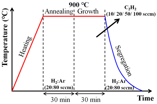 The detailed process schedule for graphene growth is shown in Figure 3. Step 1 is heating to the reaction temperature, using a turbopump to maintain a high vacuum atmosphere (0.000003 Torr) and heating from 12.8 °C/s to 900 °C. Step 2 is an annealing step in which H2 and Ar are injected at 20 and 80 sccm, respectively, while maintaining the heating temperature, in which the oxide layer and residual contaminant on the iron foil surface are removed and the grain boundary of the surface is increased to facilitate graphene formation. In Step 3, after the heat treatment was completed, acetylene gas was injected as the main growth stage, and synthesis was performed for 30 min. At this stage, acetylene is decomposed and penetrates and diffuses on the surface of substrate. Step 4 is the cooling step, the last step in graphene synthesis. H2 and Ar were introduced at flow rates of 20 sccm and 80 sccm, respectively, and the heater cover was opened to quickly cool to room temperature at a rate of about 24.5 °C/s.