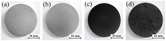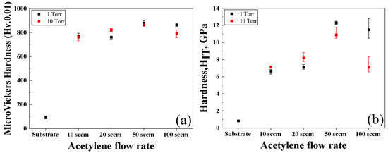 As shown in Figure 6, the microstructure of carbon deposited to the substrate according to the acetylene flow rate at 10 Torr process pressure was observed using an optical microscope. Under 20 sccm conditions, the specimen surface mostly has a dark gray area, with some black particles. In particular, as the flow rate increases, the area with black color increases, and most of the surface under the 100 sccm treatment condition was deposited with a black color layer, which is expected to be a carbon film.