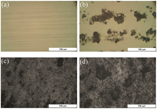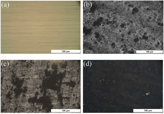 As shown in Figure 5, the microstructure of carbon deposited to the substrate according to the acetylene flow rate at 1 Torr process pressure was observed using an optical microscope. The difference in surface optical contrast is clearly observed depending on the acetylene flow conditions. Carbon was not observed on the surface of the specimen under the 10 sccm condition, and as the flow rate increases from 20 sccm, the area of dark gray carbon deposition increases. Under the 50 sccm condition, the overall surface exhibits a dark gray color. As the flow rate increases, the proportion of the surface area that appears black also increases.