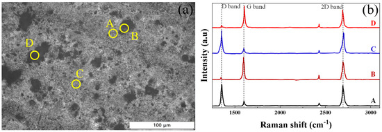 To identify the bonding structure of the carbon layer applied to the surface of the specimen under the conditions of 10 torr and 20 sccm, Raman analysis was performed by selecting four locations (A, B, C, D) where carbon was applied, as shown in Figure 7. Peaks commonly detected at all locations are broadly divided into two types: G band (1580 cm−1) and 2D band (2700 cm−1). G band and 2D band are formed by E2g vibrational mode and second-order two phonon mode, respectively [30]. The D band (1350 cm−1) is not measured in defect-free graphene, but is easily observed in graphene whose symmetry is broken due to structural defects [31]. The A, C locations have a dark gray color, and the intensity of the 2D peak is higher than that of the G peak; therefore, they are judged to be a single layer graphene. The B, C locations have a black color, and are judged to be graphite because the 2D peak and G peak are almost similar [32].