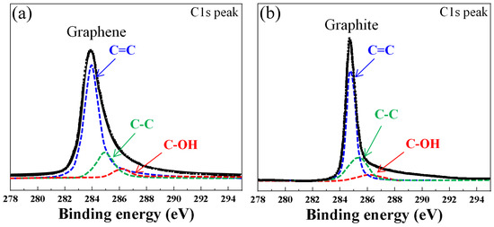 Using Raman analysis, different carbon coating layers (graphite, graphene) were distinguished by color at each location and compared through their chemical bonding structures. Figure 8 shows the C1s spectra analyzed by XPS for the dark gray and black areas. In the C1s spectra, the C=C bond and C-C bond were detected at 284.5 eV and 285.3 eV, respectively, and the C-OH bond was detected at 286.6 eV. The area of the C-C bond generated by sp3 bonding is smaller in the black area, which is assumed to be graphite, than in the dark gray area. In particular, graphene with the dark gray area has a higher C-OH bond than graphite. It is inferred that the peaks of these bonds increase due to the segregation reaction from the dissolved carbon, not due to carbon coating by pyrolysis.