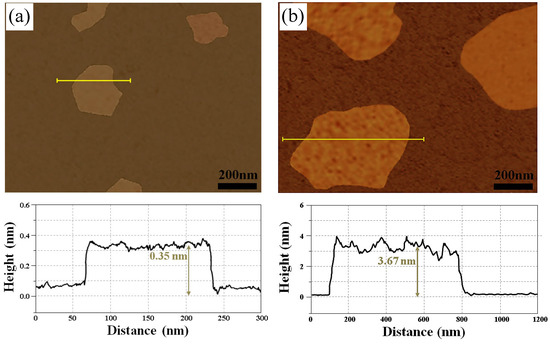 AFM equipment was used to measure the lateral size and thickness of carbon layers with different optical properties observed in Figure 7. Figure 9 shows some representative AFM images with height profiles of the lines being shown on the bottom of each image. Figure 9a is an AFM image measuring the dark gray area, and the lateral size and thickness of the carbon layer were measured as 175 nm and 0.35 nm, respectively. As a result of external factors such as AFM equipment and substrate, the dark gray area is considered to be monolayer graphene, as multilayer graphene is usually measured as 0.5 and 1 nm by AFM equipment. Figure 9b shows a wide scan image of a carbon flake with a black color, and the lateral size and thickness of the carbon layer were measured to be 700 nm and 3.67 nm, respectively. Since the pyrolytic carbon formed on the surface of the specimen by pyrolysis has a size of 2–15 μm, the carbon layer is considered to be graphite.