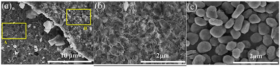 SEM images of as-deposited layers at 20 sccm C2H2, 10 torr: (a) A-B boundary; (b) A zone; (c) B zone.
