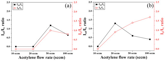 Figure 11 shows the results showing the change in Raman spectra intensity ratio according to process pressure and acetylene flow rate. The relative peak ratio of the G band and the 2D band is related to the number of graphene coating layers [33,34]. The smaller the ratio between the G peak and the 2D peak (I2D/IG), the more likely it is to have a turbostratic structure with a graphitic structure or graphene with a multilayer structure [35]. On the other hand, as I2D/IG increases, single-layer graphene, which is frequently observed in physical vapor deposition, can be observed [36]. In the case of 1 Torr condition in Figure 11a, the Raman peak was not measured until 20 sccm, but the Raman peak due to the carbon film layer was observed from 50 sccm. As the acetylene flow rate increases, I2D/IG tends to decrease and the carbon structure changes from a single-layer graphene structure to a multi-layer graphene structure. As the acetylene flow rate increases, the ID/IG ratio decreases; therefore, it is easy to form a carbon structure with low defect density and high crystallinity. In particular, the carbon structure can vary depending on the pressure difference, and in the case of 10 Torr conditions, the I2D/IG ratio is about 30% lower than 1 Torr. This is because the acetylene density inside the furnace increases due to high pressure; therefore, multilayer graphene or graphite is likely to be formed under the same flow rate conditions. Additionally, as the acetylene flow rate increases, the ID/IG ratio increases, resulting in lower crystallinity and the formation of a low-quality carbon structure.