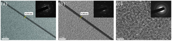Figure 12 shows the TEM image and Selected Area Electron Diffraction (SAED) pattern results analyzed using HRTEM on the surface of the specimen treated according to the acetylene flow rate. HRTEM images are data that can directly confirm the quality of graphene, such as the number of carbon layers deposited on the surface of the specimen and bonding structure. The carbon structure formed at a relatively low acetylene flow rate (20 sccm) is few layer graphene (FLG), which has approximately four layers with an interlayer spacing of about 0.316 nm (Figure 12a). When the acetylene flow rate is 50 sccm, the number of layers of FLG film increases from 6 to 7, and has a tendency almost similar to the I2D/IG ratio, which is inversely proportional to the number of layers (Figure 12b). Under the acetylene flow rate (20, 50 sccm) conditions at which the FLG film was formed, the SAED pattern has many diffraction spots similar to the carbon arrangement of graphene and is highly crystalline. On the other hand, Figure 12c is a TEM image obtained under the condition of an acetylene flow rate of 100 sccm. It has a disordered carbon arrangement, and the SAED pattern is consistent with a ring-shaped graphite structure.