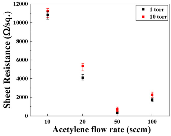 Figure 14 shows sheet resistance data measured on the surface of the carbon-deposited specimen according to the acetylene flow rate. Regardless of the process pressure, when the acetylene flow rate increases, the sheet resistance value decreases rapidly and then tends to increase again at 100 sccm. In the case of 10 sccm, carbon is diffused and solidified on the surface of the steel material, but since carbon is not deposited, the sheet resistance is approximately 10,000 Ω/sq, which is similar to that of a general substrate. Since carbon begins to be partially deposited at a flow rate of 20 sccm, the sheet resistance is about 4000 Ω/sq, which improves the electrical properties by more than two times. The 50 sccm condition is considered to be the condition with the best electrical properties, with a carbon structure believed to be the graphene formed and sheet resistance in the range from 300 to 800 Ω/sq. However, under the condition of 100 sccm, which has the highest flow rate, a graphite structure is deposited on the surface; therefore, the sheet resistance ranges from about 1500 to 2500 Ω/sq. The reason why electrical properties differ depending on the acetylene flow rate is due to the “patching effect,” and sheet resistance is determined by differences in microscopic defects such as cracks, grain boundaries, and holes depending on the type of carbon deposited on the surface of the steel or the number of layers within the carbon structure [37].