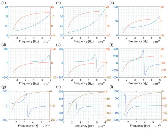 Transverse (blue) and longitudinal (orange) components of the effective permittivity of HMMs with different filling factors: (a) f = 0.1, (b) f = 0.2, (c) f = 0.3, (d) f = 0.4, (e) f = 0.5, (f) f = 0.6, (g) f = 0.7, (h) f = 0.8, and (i) f = 0.9. Only the real parts of the effective permittivities of the HMMs are shown in the figure.