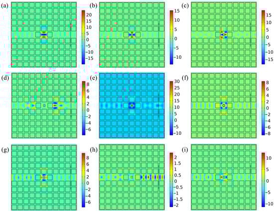 Profiles of the magnetic fields (Hz) when light propagates in the PhC HMM cavity system. (a) Incident light frequency: 455 THz, HMM filling factor: 0.1. (b) Incident light frequency: 452 THz, HMM filling factor: 0.2. (c) Incident light frequency: 488 THz, HMM filling factor: 0.3. (d) Incident light frequency: 466 THz, HMM filling factor: 0.3. (e) Incident light frequency: 438 THz, HMM filling factor: 0.3. (f) Incident light frequency: 496 THz, HMM filling factor: 0.5. (g) Incident light frequency: 522 THz, HMM filling factor: 0.7. (h) Incident light frequency: 469 THz, HMM filling factor: 0.8. (i) Incident light frequency: 539 THz, HMM filling factor: 0.9.