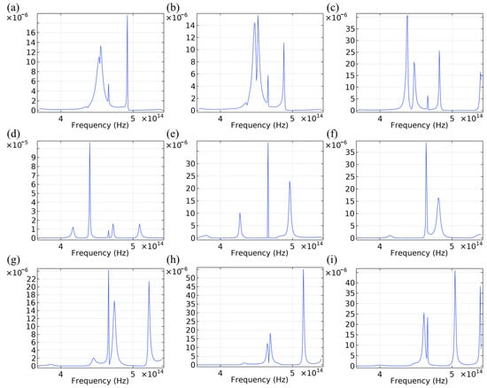 The properties of the HMM cavity were further investigated by calculating the transmission spectrum. Based on the four types of modes identified, four distinct types of resonant peaks were observed in the transmission spectra. The first type consists of resonant peaks corresponding to dielectric modes, which occur when the HMM acts as an effective dielectric. These resonant peaks are observed at the following values: 455 THz and 492 THz for f = 0.1 (Figure 4a); 452 THz, 466 THz, and 488 THz for f = 0.2 (Figure 4b); 438 THz, 447 THz, 482 THz, and 539 THz for f = 0.3 (Figure 4c); and 417 THz, 440 THz, 466 THz, 472 THz, and 509 THz for f = 0.4 (Figure 4d). These resonant peaks exhibit either a large full width at half maximum (FWHM), indicating small Q-factors, or a small FWHM, indicating large Q-factors. Modes with larger Q-factors are particularly suitable for optical switching applications due to their high extinction ratios. The second type consists of resonant peaks corresponding to metal modes, which correspond to the unique modes in Figure 3g–i observed when the HMM acts as an effective metal. These resonant peaks are found at the following values: 464 THz and 481 THz for f = 0.6 (Figure 4f); 466 THz, 474 THz, and 522 THz for f = 0.7 (Figure 4g); 465 THz, 469 THz, and 515 THz for f = 0.8 (Figure 4h); and 461 THz, 466 THz, 504 THz, and 539 THz for f = 0.9 (Figure 4i). Resonant peaks of metal modes typically exhibit large FWHMs. Comparing mode profiles reveals that metal modes experience higher material losses than dielectric modes, indicating smaller Q-factors for the cavity. The third type consists of resonant peaks corresponding to type-I HMM modes, observed when the HMM acts as a type-I HMM. These resonant peaks are observed at 427 THz and 466 THz for f = 0.5 (Figure 4e). The fourth type consists of resonant peaks corresponding to type-II HMM modes, observed when the HMM acts as a type-II HMM. These resonant peaks are observed at 496 THz for f = 0.5 (Figure 4e). Resonant peaks of type-I HMM and type-II HMM modes typically exhibit small FWHMs and high sensitivity to frequency, showing great potential for application in optical switching. There are several transmission peaks in Figure 4 with very narrow widths. For instance, the resonance peak at 466 THz, as shown in Figure 4e, corresponds to a mode with a Q-factor of 932, indicating a strong potential for use in filtering and switching applications. The high Q-factors of the modes observed in the transmission spectra indicate their strong potential for use in highly sensitive optical switching. When nonlinearity is introduced, the resonant peaks will shift, and the high Q-factor or narrow width of these peaks suggests that even a slight shift will result in a dramatic change in wave amplitude. For example, in Figure 4e, if a shift occurs, the resonant peak at 466 THz may disappear, causing the transmission at 466 THz to drop to nearly zero.