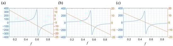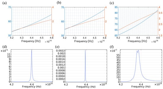 According to Equations (3) and (4), the transverse and longitudinal components of the effective permittivity of HMMs can be calculated as functions of frequency. At different filling factors, a transition point in the effective permittivity may exist. For instance, with a filling factor of 0.3, the transition point occurs at 331 THz, where the longitudinal component of the effective permittivity changes from a negative to a positive value. This transition marks a shift in the HMM’s properties: before the transition, it behaves as an effective type-I HMM; after the transition, it acts as an effective dielectric. This property is crucial for modifying wave propagation in HMMs. Not only does the transition point of change, but the transition point of also shifts with varying filling factors, altering the HMM type and its properties. Near the transition point of , its value changes dramatically, indicating that significantly affects the HMM’s properties. This sensitivity near the transition point can be observed in Figure 2d–i. For example, in Figure 2f, with a filling factor of f = 0.6, the transition point is at 409 THz, where and the curve of has a steep slope. The HMM transitions from a type-I HMM to an effective metal. Typically, an HMM showing properties of an effective metal does not support propagation modes. Near the transition point, the permittivity changes dramatically. For example, the transverse component of the permittivity near 4.10 THz, as shown in Figure 2f, undergoes a significant shift. A small frequency change from 4.00 THz to 4.20 THz results in a permittivity change from 275 to −275, which substantially alters the properties of the HMM and modifies wave propagation. Operating near the transition point allows for easier control of wave propagation, enabling the HMM to function effectively as a switch.