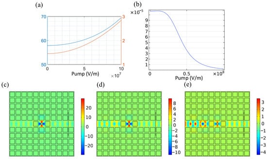 Furthermore, we introduce nonlinearity into the cavity system to investigate the nonlinear response of the HMM cavity. In the previous section, we used Ag as the material for the metal layers of the HMM rod. Ag itself exhibits nonlinear behavior under strong fields, characterized by a Kerr coefficient of 2.49 × 10−8 + 7.16 × 10−9i. Assuming a homogeneous pump, the effective permittivity of the HMM can be calculated using Equations (3) and (4), which vary with different pump powers. Figure 6a–c depict the effective permittivity of HMMs as a function of frequency. Note that infrared light is used as the pumping source, with the amplitude represented by the square of the electric field of the infrared light. Therefore, the electric field unit (V/m) is used to describe the amplitude of the pump. It is evident from the figures that when the pumping power reaches 1 × 108 V/m, the effective permittivity of HMMs changes significantly. Consequently, the transmission characteristics of the cavity system also undergo dramatic changes, as illustrated in Figure 6d,e. This phenomenon can be leveraged for tunable light filtering applications, as evidenced by the modification of the center frequency and bandwidth of the transmission curves in Figure 6d,e.