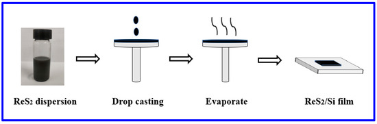 The preparation process of the ReS2/Si heterojunction films is shown in Figure 1. Herein, we used the liquid-phase exfoliation method to prepare ReS2 nanodispersions (ReS2 nanoparticles and absolute ethanol were mixed in a 1:10 ratio). We placed the high-resistance silicon wafer substrate on a hot plate at 80 °C, poured the nanodispersion droplets on the 1.5 cm × 1.5 cm substrate and repeated the process 2–3 times. With the complete evaporation of the ethanol, the preparation of the ReS2/Si heterojunction layer was completed.
