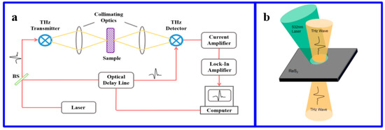 In order to study the terahertz properties of layered ReS2/Si heterostructure films, a transmission THz TDS system was built for this paper. The optical path diagram of the terahertz time-domain spectroscopy system is shown in Figure 3a, which is mainly composed of femtosecond lasers, beam splitters, terahertz source generators, focusing lenses, terahertz detectors and optical delay systems. The major devices for terahertz source generation are shown in Table 2. The experimental setup uses photoexcited active materials to regulate the terahertz characteristics, and the TDS test system must be in a dry environment during the test to eliminate the influence of environmental factors such as water vapor on the test results. Since the band gap of the ReS2/Si sample in the experimental study described above is 1.46 eV, a CW laser with a central wavelength of 520 nm is used as the pump light. During the test, the terahertz wave is vertically irradiated on the surface of the ReS2/Si film sample; the diameter of the terahertz spot is about 1 mm, the pump laser is obliquely irradiated on theReS2/Si film, and the spot area is 3 mm × 1.5 mm. The pump spot must coincide with the terahertz radiation source spot and must be larger than the terahertz radiation source spot to ensure that the heterojunction film is completely pumped by the laser at the terahertz wave transmission position, as shown in Figure 3b. At this time, the ReS2/Si heterojunction (with Si as the substrate) is irradiated by the pump laser, generating a large number of photogenerated carriers in the pump area, changing the conductivity of the sample in this area. When the terahertz wave passes through the sample, it is scattered or absorbed by the photogenerated carriers, reducing the transmission power of the terahertz wave, and ultimately achieving the effect of modulating the transmission characteristics of the terahertz wave.