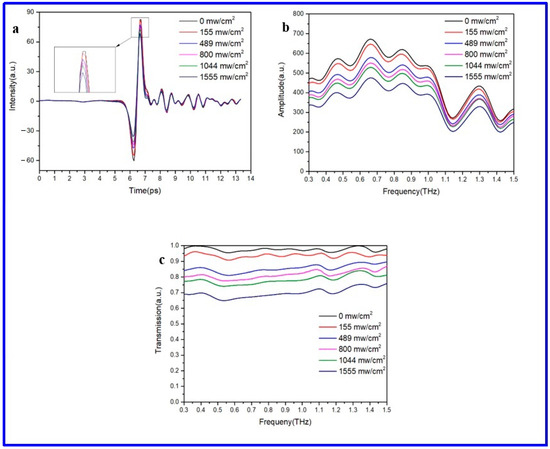 Then, a laser pumping sample is introduced, the voltage of the laser is gradually increased, and the terahertz time-domain data at different laser power densities are obtained by conversion, as shown in Figure 4a. It can be seen from the figure that as the laser intensity gradually increases, the amplitude of the received terahertz wave also decreases, and the two are inversely proportional, which is also consistent with the above theory. The time-domain spectra obtained in Figure 4a are converted into the corresponding frequency-domain spectra through Fourier transform, as shown in Figure 4b. It can also be seen that as the laser intensity increases, the amplitude of the terahertz wave passing through the sample gradually weakens.