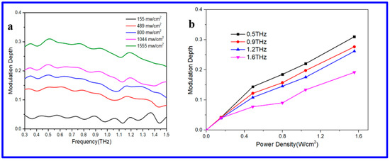T0 is the terahertz transmittance of the unpumped sample and Tp is the terahertz transmittance of the sample when laser pumped. Figure 5a shows the amplitude modulation depth curve of the sample in the range of 0.3–1.5 THz under different laser pump power conditions. It can be seen that the amplitude modulation depth of the sample in the terahertz region continues to increase with the increase in pump laser intensity, and when the laser power density reaches 1555 mW/cm2, the amplitude modulation depth of the sample in the range of 0.3–1.0 THz can be stabilized at about 30%. Figure 5b shows the effect of power density on the amplitude modulation depth at different frequencies (0.5 THz, 0.9 THz, 1.2 THz and 1.6 THz). It can be seen from Figure 5b that the amplitude modulation depth at different frequency points increases with the increase in laser power density, and the maximum modulation depth can reach 31% at the 0.5 THz frequency point, which proves that the ReS2/Si heterojunction film can achieve efficient and broadband terahertz modulation in this experiment.