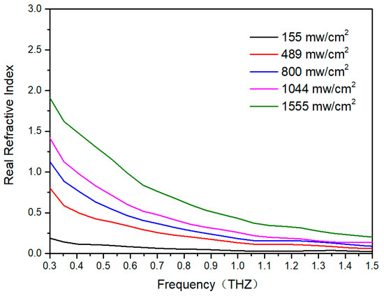 Tfilm (ω) is the transmittance obtained in the previous section. According to Equations (4)–(6), the refractive indices of ReS2/Si-based heterojunction-based films at different powers are obtained. Figure 6 shows the refractive index curve based on the ReS2/Si heterojunction film. It can be seen that as the laser intensity increases, the refractive index of the sample also increases. At a power density of 1555 mW/cm2, the refractive index gradually decreases from 1.9 to about 0.4 within the range of 0.3–1.5 THz, showing a decreasing trend.