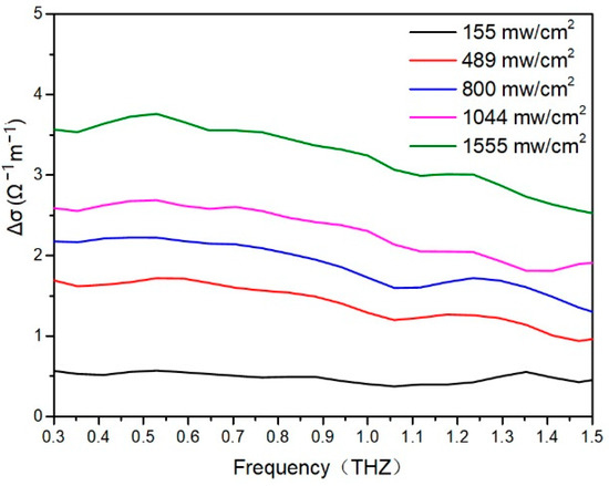 where Z0 is the free-space impedance. The conductivity curve of the extracted sample is shown in Figure 7. It can be seen that as the laser intensity increases, the conductivity of the ReS2/Si heterojunction film gradually increases. For example, when the pump power density increases from 155 mW/cm2 to 1555 W/cm2, it is found that the conductivity of 0.5 Ω−1m−1 at 0.5 THz gradually climbs to about 3.8 Ω−1m−1, an increase of nearly eight times, which also echoes the terahertz modulation effect mentioned above. The reason is that the substrate and the ReS2 film form a heterojunction, which generates photogenerated carriers under the irradiation of the laser, and as the laser intensity increases, more photogenerated carriers are generated and the conductivity increases. The higher the conductivity, the more terahertz waves the materials can absorb. Therefore, the greater the transmittance of terahertz waves, the better the modulation.