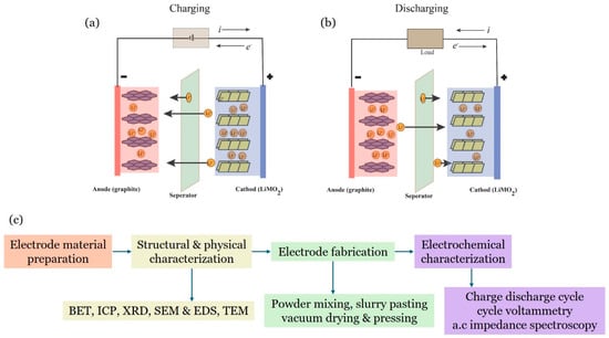 Traditional LIBs are made up of four parts: positive electrodes (cathodes, e.g., LiCoO2, LiFePO4), negative electrodes (anodes, e.g., carbon), a separator, and an electrolyte, e.g., lithium salt/LiPF6 (Figure 1a,b). During the charge and discharge processes, Li-ions move from the cathode to the anode. The charging process happens when Li-ions travel through the separator with the help of a conductive electrolyte from the Li metal oxide cathode to the carbon-based anode. When the cell is subjected to an external load, a discharging process occurs in which Li atoms intercalated in the anode lose electrons and transform into Li-ions, which then return to the associated counter-cathode []. Electrons that complete the half reaction traverse an external wire since electrolytes do not contain free electrons. The composition and structure of electrodes (both cathode and anode) are important aspects influencing battery performance. To create an electrode, conductive additives and active materials (e.g., carbon black, CNTs, carbon nanofibers (CNFs), graphene, and transitional metal oxides) are attached to a current collector made of metal (e.g., Cu or Al foil) with binders based on polymers. Between active materials and the current collector, conductive additives build a network that facilitates electron transfer, and the binder maintains the electrode’s stability and integrity during battery cycling. Figure 1c depicts the procedures in sample preparation and electrochemical property characterization.
