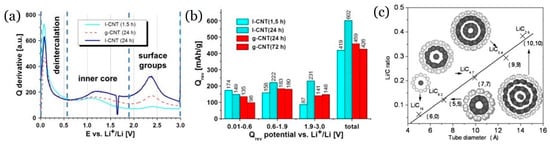 (a,b): g-CNT and l-CNT. (a) Derivative of 1st cycle reversible capacity; (b) reversible capacity of g-CNT and l-CNT, divided into three potential areas of Gr layer deintercalation (0.01–0.6 V), inner core de-insertion (0.6–1.9 V) and extraction from functional groups (1.9–3.0 V); ~0.5 mg/cm2, 1 M LiPF6 in 1:1 EC:DEC, 50 mAh/g. Adapted with permission from ref. []. Copyright © 2011 Elsevier B.V. (c) Li/C ratio vs. tube diameter. Insets illustrate the equilibrium configurations of SWNTs packed with Li atoms. White and grey balls: carbon and Li atoms, respectively. Adapted with permission from ref. []. Copyright © 2005 Elsevier B.V.