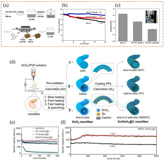 (a–c): Neuron-like Si-CNT composite. (a) The preparation approach of the neuron-like Si-CNT composite using a modified CVD method; (b) the electrochemical properties of different Si electrodes: rate capability; (c) the physical property of different Si electrodes: electronic conductivity. Adapted with permission from ref. []. Copyright © 2019 Elsevier B.V. (d–f): Multi-wall Sn/SnO2@Carbon hollow NFs. (d) Fabrication scheme of multi-wall Sn/SnO2@C hollow NFs. The Sn precursor nanofibers are first created using electrospinning. Solid, hollow, and WIT structured SnO2 nanofibers are produced from the same precursor by varying the heating rate during calcination. Then polypyrrole (PPy) is in situ polymerized onto outer and inner surfaces of the above three kinds of SnO2 NF. After calcinating the PPy/SnO2 composite nanofibers in N2, Ppy turns to carbon, which partially reduces SnO2 to metal Sn. As a result, WIT, TIT, and WIDWT Sn/SnO2@C composite NFs are prepared. (e) Cycling performance for 200 cycles (at 1 A/g rate). (f) Long cycling performance of the WIDWT Sn/SnO2@C at a current rate of 1 A/g and 5 A/g for 2000 cycles. Adapted with permission from ref. []. © 2019 Wiley-VCH Verlag GmbH & Co. KGaA, Weinheim.