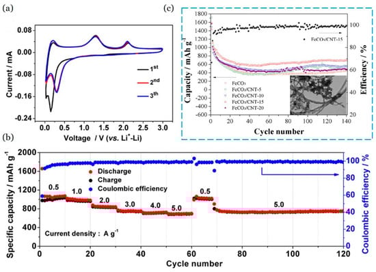 Because of their high capacity, low cost, and natural availability, FeCO3 nanomaterials have been extensively researched as anode materials for LIBs. Nonetheless, the sluggish diffusion of Li-ions in bulk materials and their low electronic conductivity limit FeCO3’s power performance. The FeCO3/carbon nanotube composites (FeCO3/CNTs) were created employing CNTs, ferrous sulfate, and urea as raw ingredients in a single-step in situ crystallization method. The inclusion of modest CNTs can significantly improve the electrochemical performance of FeCO3. At a current density of 200 mA/g, FeCO3/CNT-15 (FeCO3/CNT-x, where x is wt%) has an initial discharge capacity of 1436 mAh/g and retains a capacity of 694 mAh/g after 140 cycles []. Figure 4c shows plots of discharge–charge capacities against cycle number for voltages ranging from 0.05 to 3 V and current densities of 200 mA/g. The as-prepared FeCO3 and FeCO3/CNT composites can achieve an initial discharge capacity of more than 1400 mAh/g. The generation of SEI films and electrolyte deterioration are the primary causes of the first capacity reduction. The capacities decreased during the first twenty cycles, but subsequently stabilized at 451, 560, 550, 694, and 481 mAh/g for FeCO3, FeCO3/CNT-5, FeCO3/CNT-10, FeCO3/CNT-15, and FeCO3/CNT-20, respectively, throughout the next 140 cycles. FeCO3/CNT-15 demonstrated the best electrochemical performances. After 10 cycles, the coulombic efficiency of FeCO3/CNT-15 approached 100%, and the maximal reversible capacity of 694 mAh/g was maintained even after 140 cycles. The structure of FeCO3/CNT-15 after 140 cycles stayed almost identical to that of FeCO3/CNT-15 prior to the cycling stability test [].