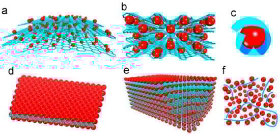 Schematic of structural models of Gr/metal oxide composites: (a) Anchored model: nanosized oxide particles are anchored on the surface of Gr. (b) Wrapped model: metal oxide particles are wrapped by Gr. (c) Encapsulated model: oxide particles are encapsulated by Gr. (d) Sandwich-like model: Gr serves as a template for the creation of a metal oxide/Gr/metal oxide sandwich-like structure. (e) Layered model: a structure composed of alternating layers of metal oxide nanoparticles and Gr. (f) Mixed model: Gr and metal oxide particles are mechanically mixed and Gr forms a conductive network among the metal oxide particles. Red: metal oxide particles; blue: Gr sheets [].
