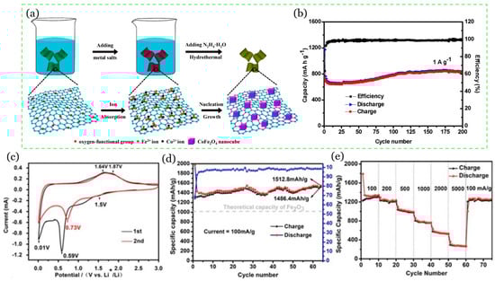 (a,b) One-pot synthesis of CoFe2O4/G. (a) Illustration of synthesis procedure for CoFe2O4/Gr; (b) cycling performance of the CoFe2O4/G electrode at 1 A/g. Adapted with permission from ref. []. © 2018 Elsevier B.V. (c–e): Hollow α-Fe2O3 nanotubes embedded in Gr aerogel; (c) CV curves of the first and second cycle for the c electrode; (d) cyclability of specific capacity and coulombic efficiency between 0.01 V and 3 V at a current density of 100 mA/g; (e) rate performance of the material at stepping current density and back to 100 mA/g at last. Adapted with permission from ref. []. © 2019 Wiley-VCH Verlag GmbH & Co. KGaA, Weinheim.