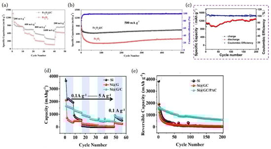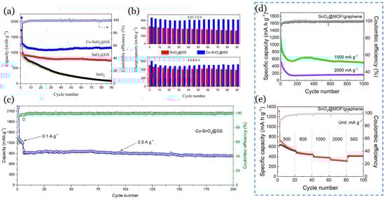 (a) Cyclic performances of the Co-SnO2@GS, SnO2@GS, and SnO2 at 0.1 A/g with the CE of Co-SnO2@GS; (b) charge capacities of Co-SnO2@GS and SnO2@GS from voltage regions of 0.01–1.0 and 1.0–3.0 V; (c) cyclic performance and corresponding CE of Co-SnO2@GS at 0.5 A/g. Adapted with permission from ref. []. (d,e): MOF/SnO2/Gr. (d) SnO2@MOF/Gr at current densities of 1000 and 2000 mA/g; (e) rate performance of SnO2@MOF/Gr at current densities of 500, 800, 1000, 2000, and 500 mA/g, respectively. Adapted with permission from ref. []. © 2020 Elsevier Ltd.