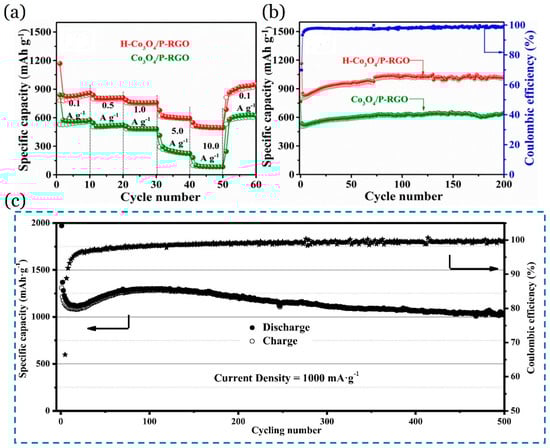 (a,b): H-Co3O4/PrGO. (a) The comparisons of rate performance (current densities, from 0.1 to 10.0 A/g); (b) cycling performance of H-Co3O4/P-rGO, Co3O4/P-rGO, and corresponding coulombic efficiency over 200 cycles (current density: 0.2 A/g). Adapted with permission from ref. []. © 2020 Elsevier B.V. (c) Cycling capability of the ZnFe2O4/rGO electrode at the current rate of 1000 mA/g. A line with stars indicates how the coulombic efficiency varies with cycle number. Adapted with permission from ref. []. © 2020 Elsevier Inc.