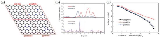 First-principles calculations were performed to investigate the effects of electron deficiency in N-doped Grs on their application in LIBs. Three different defect models, graphitic, pyridinic, and pyrrolic Grs, were used []. The pyridinic Gr was found to be the most suitable for Li storage with a high storage capacity, while the graphitic structure was the weakest of the three. It was discovered that the reversible capacity of the pyridinic structure can reach 1262 mAh/g, which is greater than the experimental 1043 mAh/g. Figure 10a shows a comparison of the most stable sites after Li atoms adsorbed on Gr sheets having different defects. Figure 10b depicts the hybridization peaks of the N and Li atoms in pyridinic and pyrrolic N-doped Gr. The binding energy between Li and pyridinic Gr is higher than for graphitic Gr. Figure 10c shows the avg. intercalation voltage of Li in the pyridinic, pyrrolic, and defect Grs, indicating the highest voltage when nine atoms of Li are embedded.