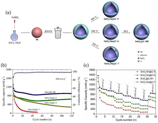 Carbon-encapsulated SnO2 hollow spheres for LIBs were created using a self-templating process from Sn spheres []. High-temperature annealing (for example, 700 °C) invariably resulted in the production of Sn on the outer surface, which was detrimental to long-term cycling. In contrast, annealing at an ideal temperature of 600 °C followed by acid etching totally encased the SnO2 within a carbon shell while maintaining a stable hollow structure (Figure 12a). After 120 cycles, the as-prepared carbon-encapsulated SnO2 hollow spheres (SnO2@C-6H) demonstrated a reversible capacity of 898 mAh/g at 200 mA/g (Figure 12b) and a promising rate capacity of 549.8 mAh/g at a high current density of ~2000 mA/g (Figure 12c). The observed excellent outcomes might be related to the development of a unique hollow structure with an increased specific surface area of 215.18 m2/g and a reasonably high degree of graphitization of the carbon shell (i.e., Raman intensity ratio of D to G band, ID/IG = 0.84). The reason for this is that the acquired hollow spheres not only provide a barrier effect for volume expansion and SnO2 aggregation, but also increase Li storage [].