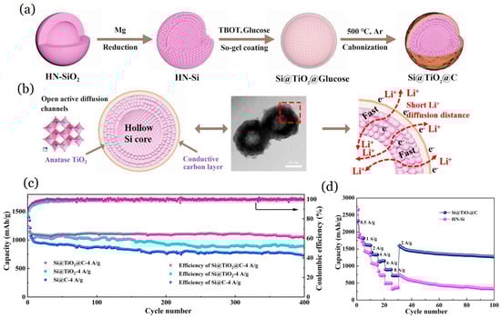 The template approach and carbon thermal vapor deposition were used to create an interconnected sandwich-type composite of carbon/Si-SiO2/carbon nanospheres []. The carbon conductive layer enhances the electronic conductivity of Si-based anodes and reduces volume expansion during discharge or charging. The interconnected sandwich carbon/Si-SiO2/carbon nanospheres composite has strong battery characteristics, with a reversible capacity of 1094 mAh/g and a reversible capacity of 1050 mAh/g after 200 cycles, and a capacity retention of 96%. A simple method for creating SiO2@C hollow spheres involves hydrolyzing tetraethyl orthosilicate (TEOS) to generate SiO2 shells on organic spherical templates []. The shells are then calcined in air to remove the templates and carbon layers are used to cover them (Figure 11d). SiO2@C hollow spheres with varying SiO2 concentrations show a steady rise in specific capacity with discharge–charge cycling. The SiO2@C with 67 wt% SiO2 content has discharge–charge capacities of 653.4/649.6 mAh/g across 160 cycles at a current density of 0.11 mA/cm2.
